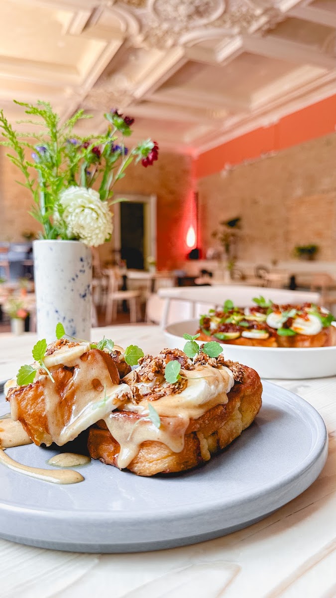 Upon entering, you are greeted by the café's grandiose interiors adorned with a tasteful shabby chic décor. This aesthetic beautifully complements the historic building, making it not just a café, but a vibrant place to gather, relax, and enjoy great food. Whether you're stopping by for a quick coffee or settling in for a leisurely brunch, the atmosphere encourages you to linger a little longer.